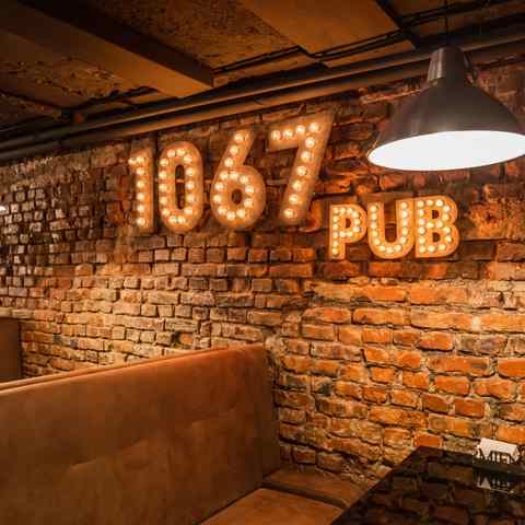 Интерьер Pub 1067 (Паб 1067) оформлен в темных спокойных тонах с элементами оригинальной кирпичной кладки, что создает уютную и дружелюбную атмосферу.