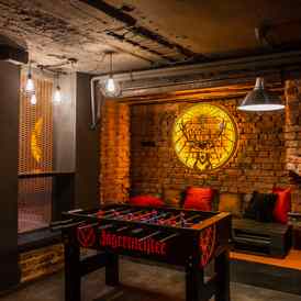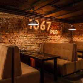 Интерьер Pub 1067 (Паб 1067) оформлен в темных спокойных тонах с элементами оригинальной кирпичной кладки, что создает уютную и дружелюбную атмосферу.
